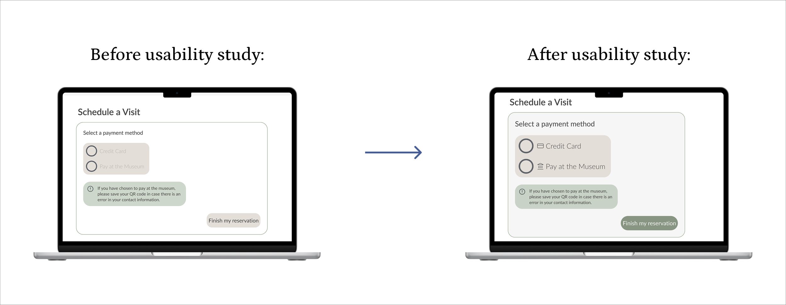 To improve task completion, the payment step was redesigned to clearly separate options and highlight the primary action, reducing hesitation and increasing user confidence before submission.