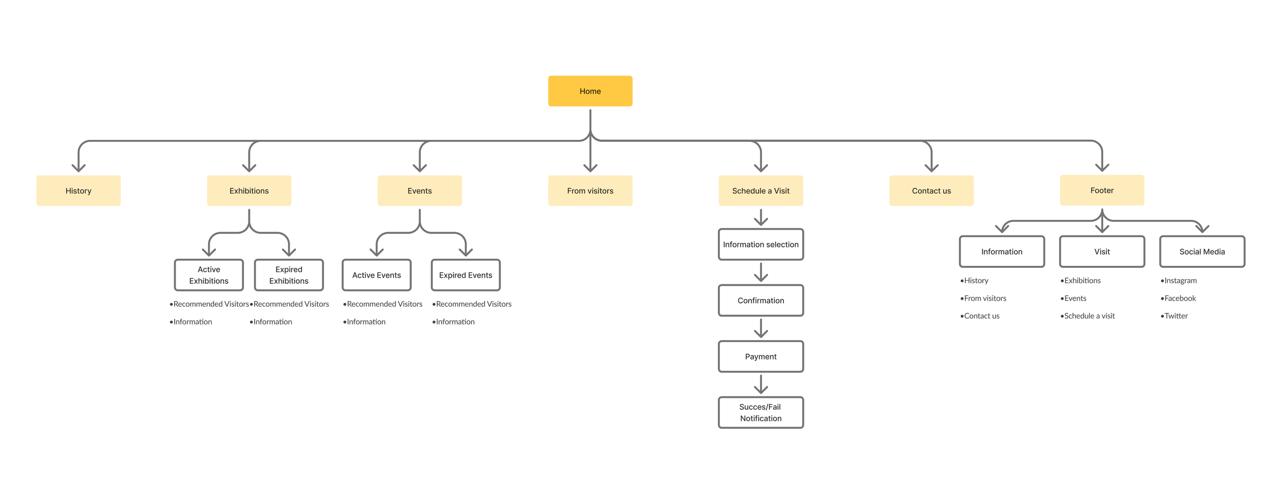 The sitemap was created by revisiting earlier user research, including personas and user journeys, to ensure the navigation reflected real user needs and behaviors. A hierarchical structure was chosen, starting with a clear homepage and expanding into main content categories and supporting subpages. This structure helps users efficiently explore exhibitions, access information, and complete key tasks such as ticket purchasing and visit planning.