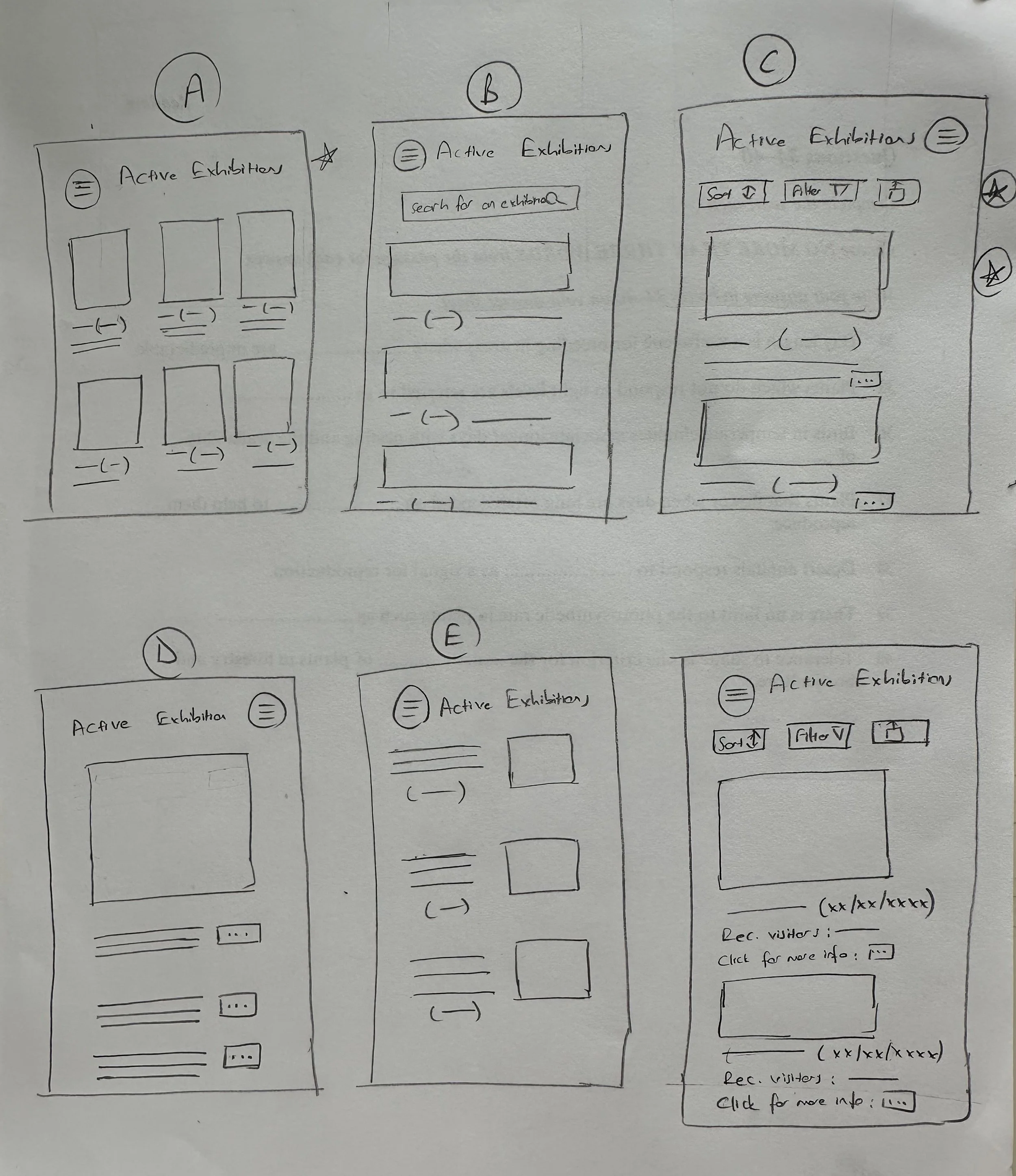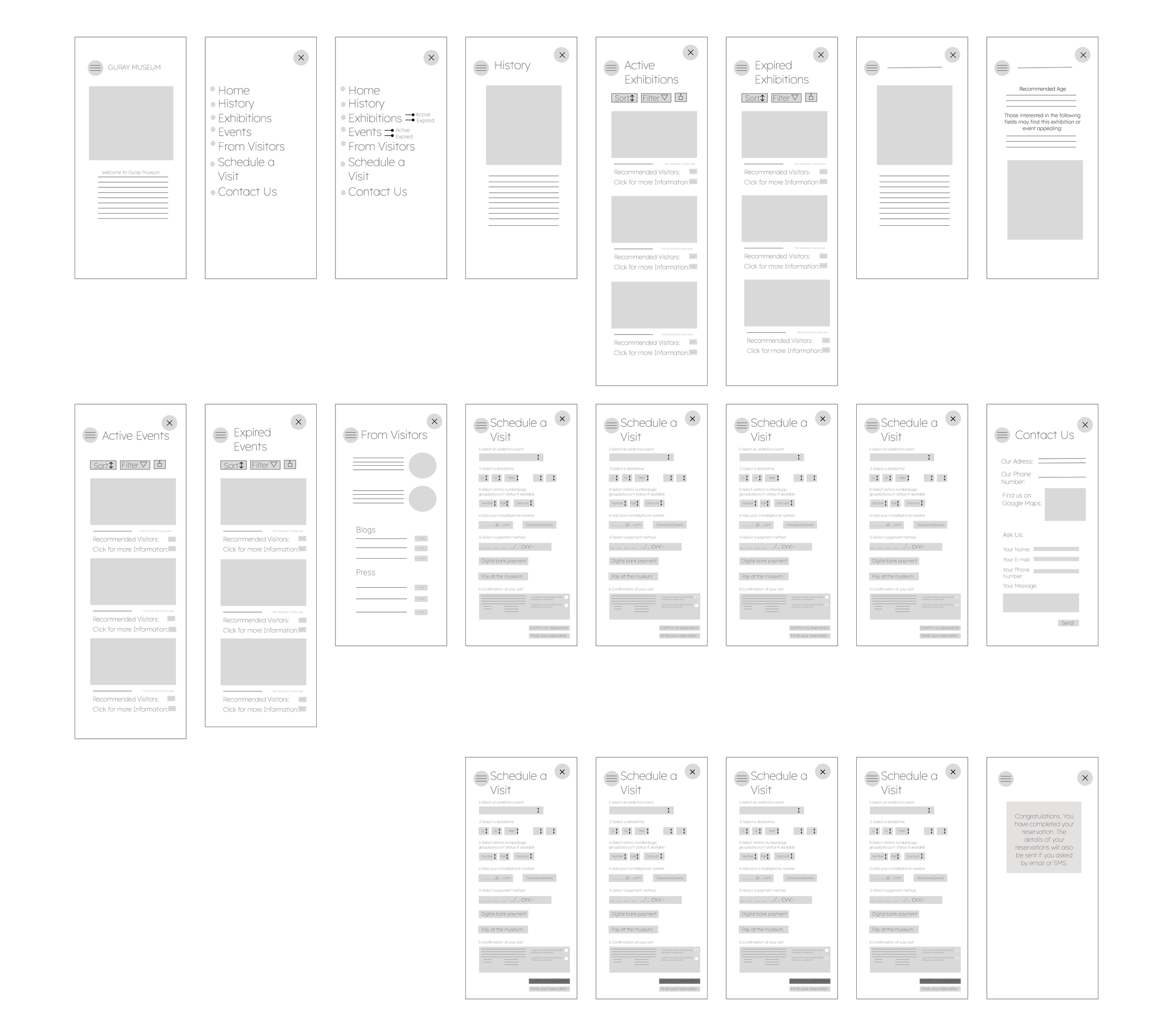 Paper and digital wireframes were transformed into an interactive prototype focused on core tasks such as browsing exhibitions, checking details, purchasing tickets, and organizing group visits. Key screens were connected to simulate real navigation, and the design was refined to improve clarity, hierarchy, and usability.