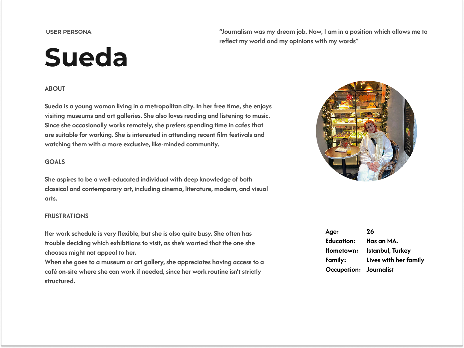 User research was conducted through interviews to understand the challenges museum visitors face. The insights were analyzed to identify recurring patterns and key pain points, which informed the creation of user personas. Major pain points included: